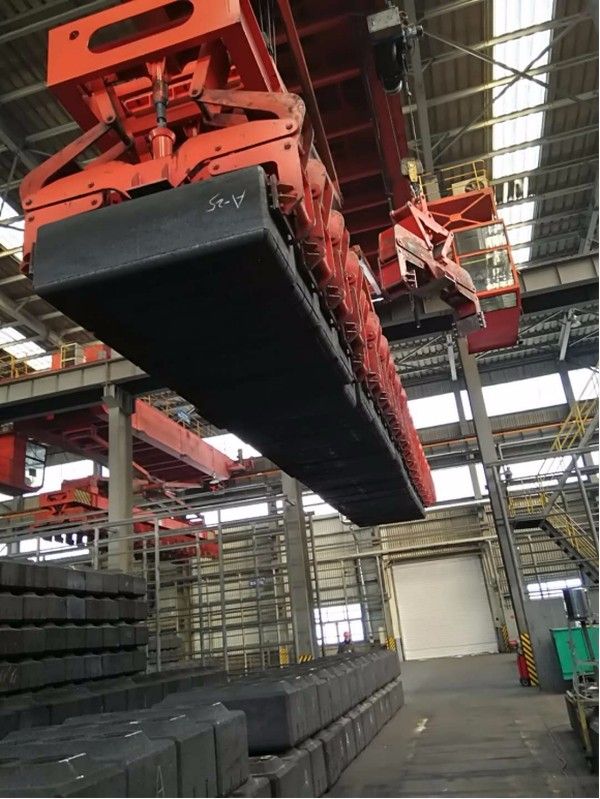 本產(chǎn)品通過(guò)自動(dòng)夾鉗,每次可夾取21塊陽(yáng)極碳?jí)K,最高可堆成8層。橋架下面裝有工字鋼,工字鋼上裝有5t電動(dòng)葫蘆,該葫蘆沿工字鋼運(yùn)行,可通過(guò)單塊自動(dòng)碳?jí)K夾鉗夾取碳?jí)K,還可在車(chē)間吊運(yùn)零星雜物。運(yùn)行和起升全部采用變頻調(diào)速,全部操作均可在操縱室內(nèi)完成。采用機(jī)械重力式自動(dòng)夾取代替氣動(dòng)方式夾取碳?jí)K,為制造廠和用戶(hù)大大節(jié)約了成本。
